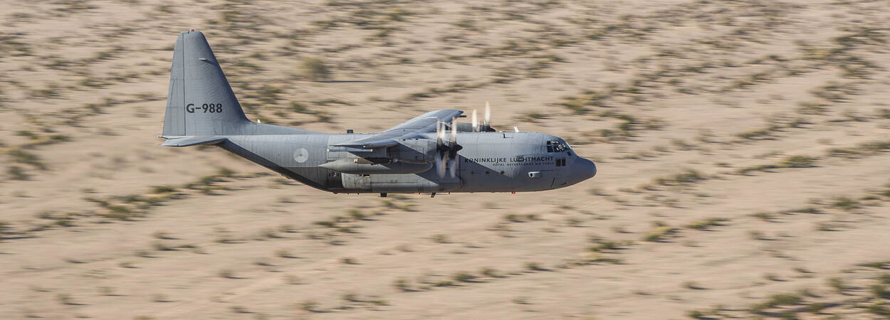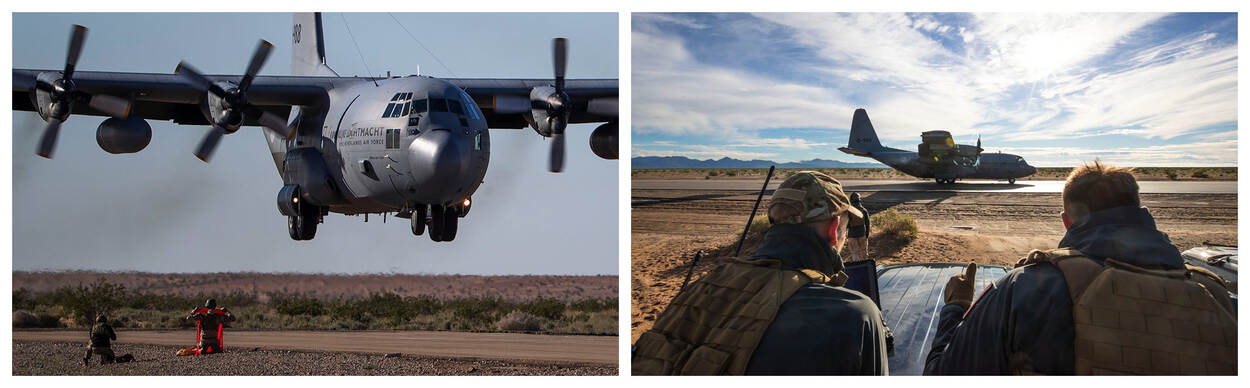 Hand in hand, collectief, joint, geef het een naam. In het Amerikaanse Yuma is er in ieder geval een duidelijk hoofddoel: met zijn állen oefening ‘Desert Bull 2018’ tot een goed einde brengen. Samen met ‘groene’ landmachtcollega’s oefent het 336 Squadron uit Eindhoven 3 weken lang in meerdere waves per dag onder andere cargodrops, paradrops en low level-vluchten. Bijzonder: nooit eerder werden de agenda’s van het héle squadron geblokt voor een dergelijke oefening.