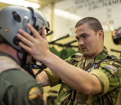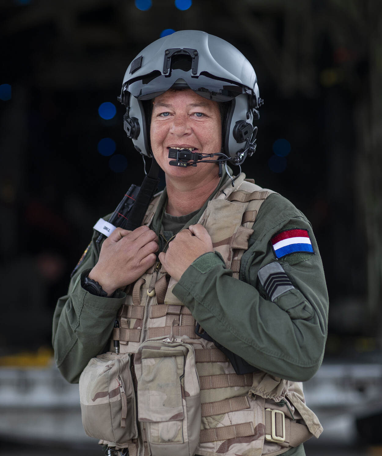 “Samen met mijn collega’s zorg ik voor alles wat de bemanning nodig om een vlucht veilig te kunnen uitvoeren. Vlieghelmen, survivalvesten, zuurstofmaskers en Night Vision Goggles. Voor iedere vlucht wordt alles afgepast en na de vlucht weer ingeleverd. Aan ons de taak om vervolgens alle zaken opnieuw te controleren. Hetzelfde geldt voor de noodzuurstofmaskers aan boord. Ook deze inspecteren wij regelmatig. Eigenlijk zijn onze werkzaamheden hier tijdens de oefening hetzelfde als thuis in Eindhoven, al is het hier met 2 toestellen en 3 waves per dag extra aanpoten.