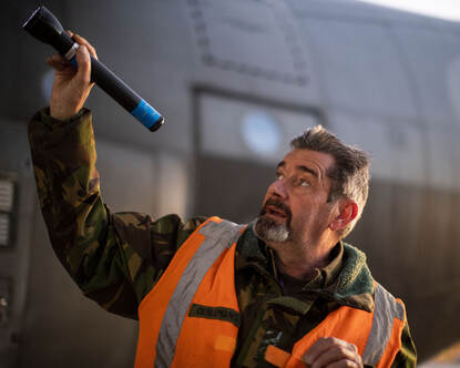 “Wij zorgen ervoor dat de C-130’s weer gereed staan voor de volgende vlucht en lossen eventuele klachten op. Dagelijks lopen wij voor en na iedere vlucht de kist na. Dat is een vrij visuele controle waarbij we letten op bijvoorbeeld de staat van de banden, eventuele lekkages, de bekabeling, de drukmetertjes van de brandblussers, noem maar op. Eens per week krijgt het vliegtuig een soort ‘supercontrole’. Hiervoor heb je doorgaans meer tijd. Dan kijken we echt de wielbakken in, meten we de remmen op, oliën we onderdelen en maken alles schoon. En naast het onderhoud zorgen we er tijdens deze oefening ook voor dat in de hangaar alles loopt en er netjes uitziet. Tja, al met al zijn we eigenlijk de hele dag wel lekker bezig!”