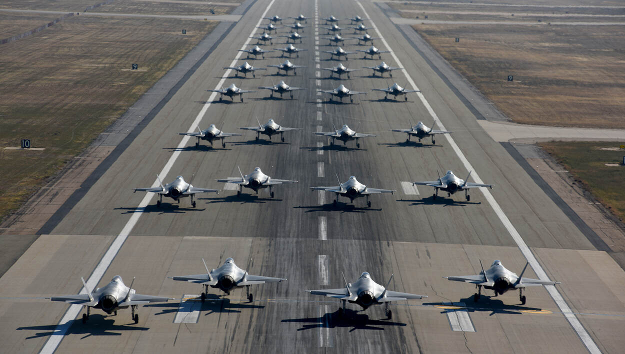 Op Hill Air Force Base, de eerste operationele basis van de USAF met de F-35, deed het personeel dit op 19 november. Met de demonstratie bevestigen de 388th en reserve-eenheid 419th Fighter Wing dat ze op een willekeurig moment met (vrijwel) al hun kisten operationeel zijn. Even goed tellen: het zijn er 36, 1 minder dan Nederland tot nu toe heeft besteld. Foto: Micah Garbarino