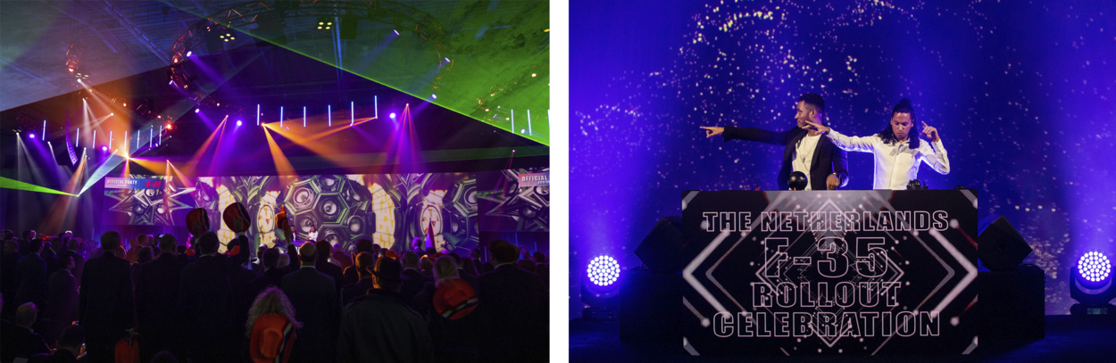 Inmiddels hangt de F-35 vlag er heel anders voor en dat was te merken in Air Force Plant 4, waarin de ruim anderhalve kilometer lange fabricagehal van de Amerikaanse vliegtuigbouwer ligt. Want naast een politieke en vooral zware militaire afvaardiging, was voor de – letterlijk – feestelijke noot ook het huidige Néderlands exportproduct nr. 1 vertegenwoordigd. Dj’s Sunnery James en Ryan Marciano luisterden het geheel op met dancemuziek waarmee zij mede de wereld hebben veroverd. Ze speelden samen met het orkest van de Koninklijke Luchtmacht.
