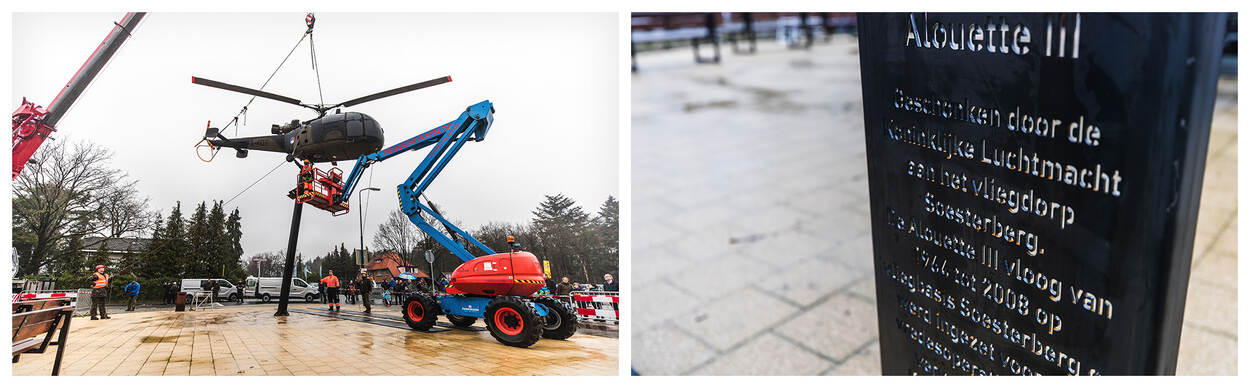 Daar waar de Alouette III’s decennialang overvlogen, staat er sinds 6 februari nu 1 op een paal. De bergingsdienst van de luchtmacht plaatste er die dag 1 midden in Soesterberg, langs de provinciale weg N237. De luchtmacht schonk de helikopter.