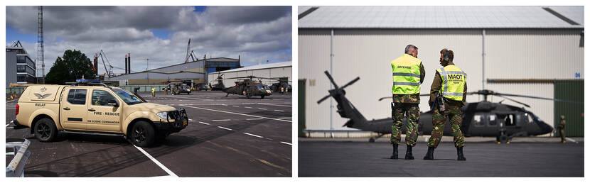 Op het overslagterrein in de Botlek bemant de luchtmacht de landingsplek van de helikopters en levert het een blusvoertuig. Het schip dat het materieel naar de VS brengt, vertrekt waarschijnlijk aan het eind van de maand.