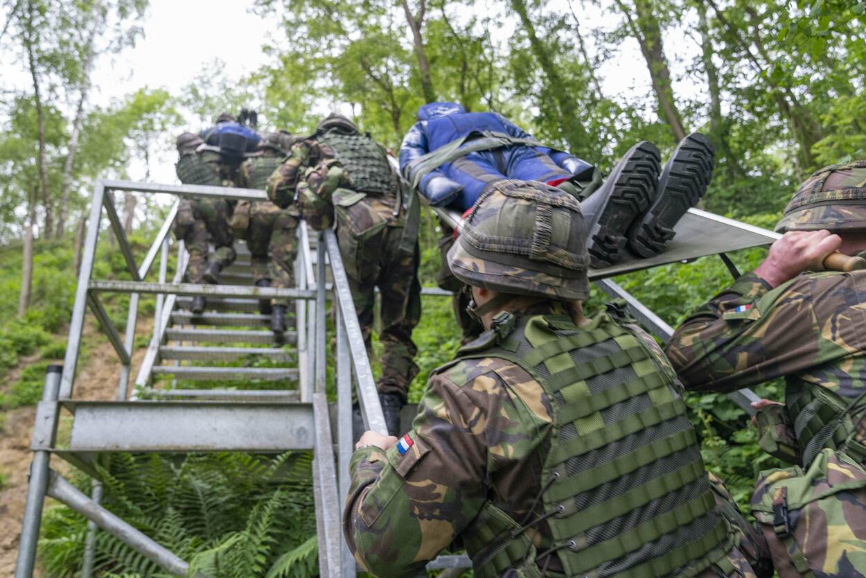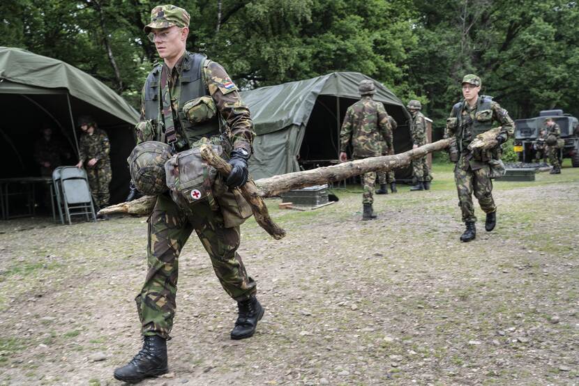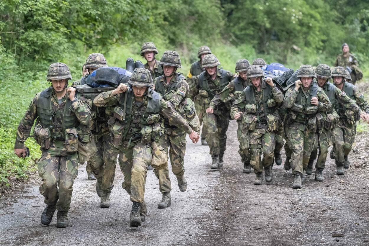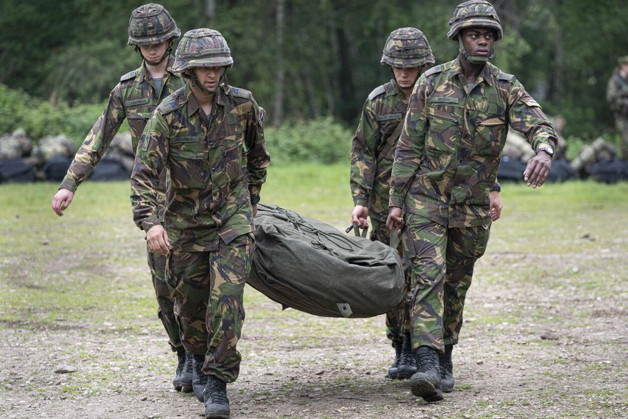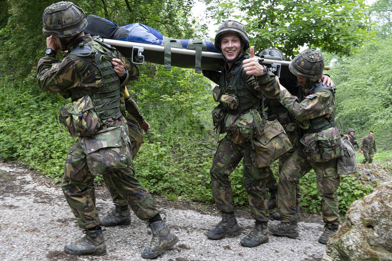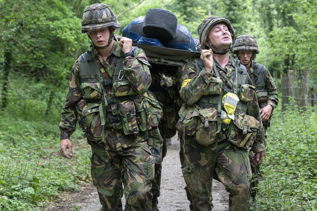 Voor lieden die later willen brallen dat de verkorte versie van de Algemene Militaire Opleiding CLSK fysiek helemáál niets voorstelt, heeft sergeant 1 Boot een aardige verrassing. Zijn toon, doen en laten veranderen spoorslags op het moment dat de cursisten de brancard-met-pop-van-70-kilo op hun schouders zetten. “En lopen! Die heuvel op”, schreeuwt de instructeur. ‘Wat is dit nu?’, zie je de militairen-in-wording denken.’ Daarnet was-ie nog zo’n schappelijke vent.’