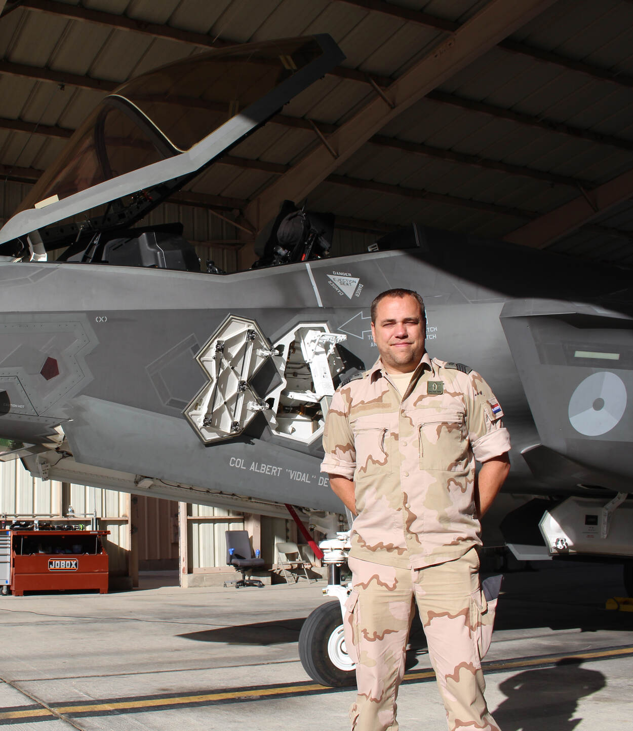 Met 9 jaar lesgeven ben ik inmiddels een ervaren KMSL-instructeur op de F-16. In 2017 mocht ik met nog 3 man naar de F-35 omscholing op Eglin in Amerika: 2 ervaren F-16 instructeurs en 2 F-35 wapentechnici. Onze lesmethodiek is duidelijk anders dan die in Amerika. Lesgeven vond ik daar niet erg efficiënt. In 4 maanden tijd kregen we ongeveer 3 uur les per dag. Weinig les dus en veel lezen en digitale opdrachten uitvoeren op de ASMT. Maar dan gebruik je een muis in plaats van gereedschap. Praktijkonderwijs is er eigenlijk niet bij, behalve de laatste 2 weken bij motorfabrikant Pratt & Whitney. Daar hebben we het wisselen van onderdelen en modules kunnen oefenen. De ‘on the job’ training kregen we op Edwards. Daar en op Luke heb ik afgelopen maanden ook geholpen bij de acceptatie van onze laatste in Amerika gebouwde F-35.