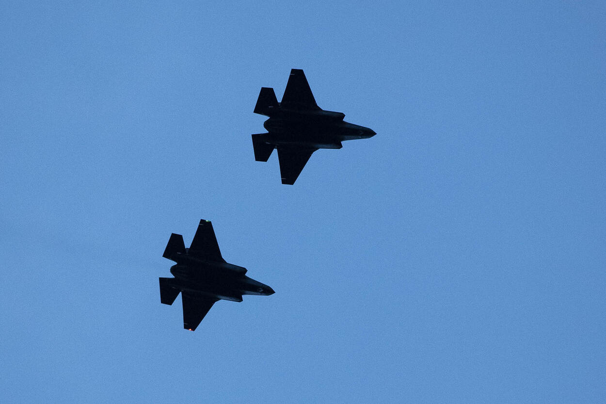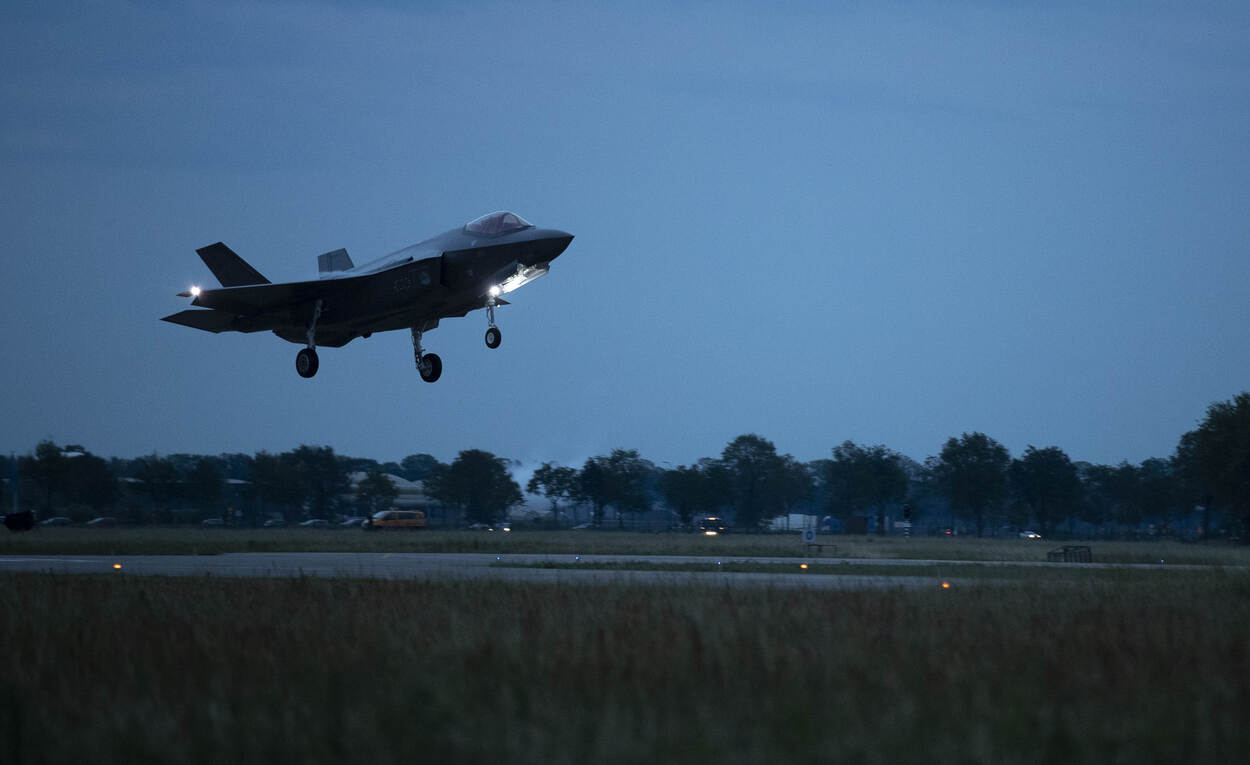 Rond 10 uur ’s avonds naderen in het bijna donker 2 vleermuisachtige silhouetten Vliegbasis Volkel. Rond dit tijdstip kunnen dat alleen nog maar de 2 Nederlandse F-35’s zijn. Foto: sergeant-majoor Hille Hillinga