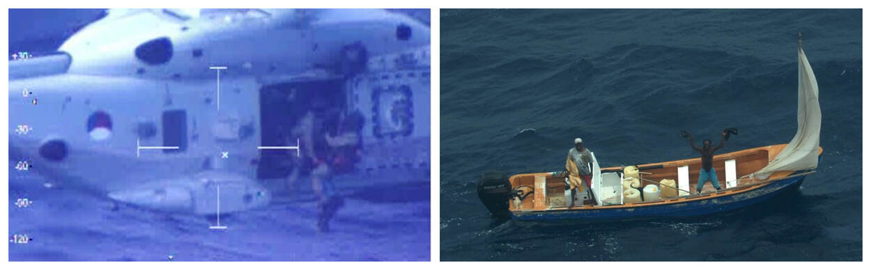 Dat zette de NH90-boordhelikopter in om beide mannen van hun vaartuig te halen en in Aruba aan land te brengen. De vissers waren op 7 juli vanuit St. Lucia de zee opgegaan, maar keerden niet terug. Sindsdien stonden ze als vermist gemeld. Uiteindelijk bleek dat de mannen op zee waren verdwaald. Aan boord hadden ze alleen een kompas. Foto’s: Defensie