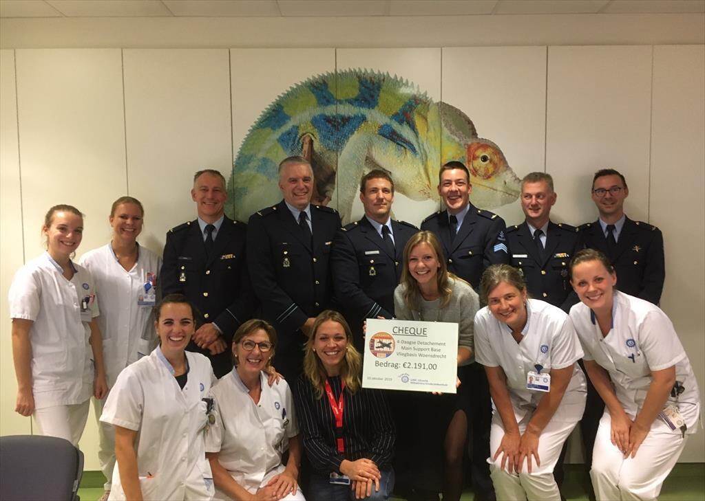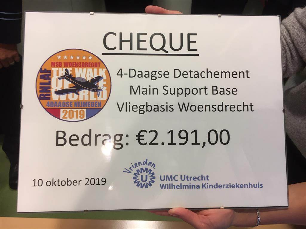 Het 4-daagse detachement van de Main Support Base Vliegbasis Woensdrecht haalde in juli €2191 op aan donaties. Dat bedrag droegen de deelnemers op 10 oktober over aan de Vrienden van het Wilhelmina Kinderziekenhuis.