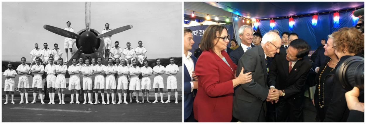 Hawker Sea Fury-vliegers Van Crugten, Hagdorn en Mulder staken op17 maart 1953 hun hand op toen er vrijwilligers werden gevraagd om ervaring op te doen aan boord van het Engelse vliegdekschip HMS Ocean. Het schip voer op dat moment in de Gele Zee, omdat er op het Koreaanse schiereiland werd gevochten. “Ze moesten de troepen op de grond ondersteunen en de aanvoerlijnen van de vijand verstoren. Ze dienden tijdens een relatief ‘rustige’ tijd, omdat de Koreaoorlog op z'n einde liep, maar vredig was het niet”, aldus Bijleveld. Ze dienden meer dan een half jaar bij No. 807 Squadron en vlogen elk 58 missies boven het oorlogsgebied. De Koreaanse Oorlog duurde van 25 juni 1950 tot 27 juli 1953. Foto l.: uit collectie Hagdorn. Foto r.: Defensie