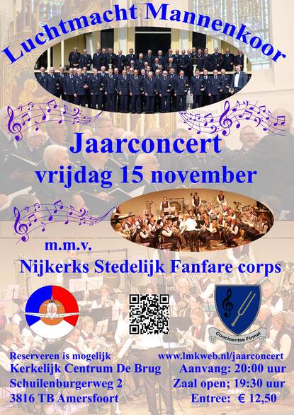 Het jaarconcert van het Luchtmacht Mannenkoor (LMK) vindt vrijdag 15 november plaats in het Kerkelijk Centrum De Brug in Amersfoort. Vanwege de centrale ligging in het land kiest het LMK niet voor het eerst voor deze locatie. Het Nijkerks Stedelijk Fanfare Corps ondersteunt het koor wederom bij dit concert.