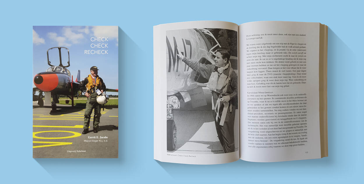 ‘Check Check Recheck – Gerrit E. Jacobs, Majoor-vlieger KLu b.d.’ met ISBN 9789491737510 is geschreven door Gerrit Jacobs en uitgegeven door Uitgeverij Nobelman in Groningen. De softback op formaat 15 x 23 cm telt 272 pagina’s is voorzien van vele tientallen kleuren- en zwart-witfoto’s. Het boek kost € 24,95 en is onder andere verkrijgbaar via de webshop van de uitgever. Kijk daarvoor op www.nobelman.nl.