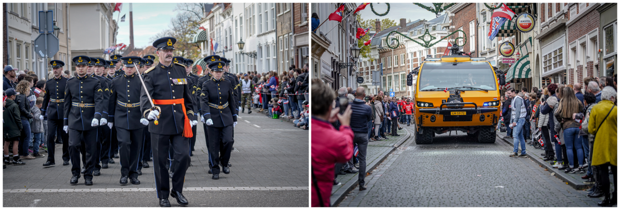 Ook een E-One blusvoertuig manoeuvreerde zich door de smalle straten van de stad, terwijl in de lucht een defilé voorbijkwam van PC-7’s, de KLu Historische Vlucht en een Belgische Spitfire. Foto’s Nathan Alblas