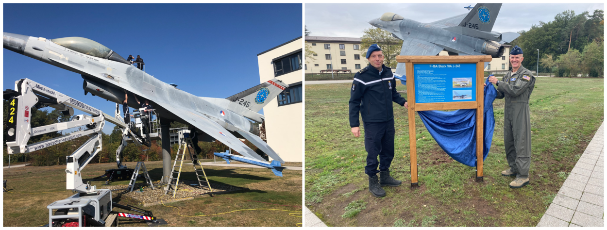 Sinds 20 december 2006 staat de Nederlandse F-16 J-245 als ‘poortwachter’ bij het HQ Aircom op Ramstein Air Base in Duitsland. Door de jaren heen is de F-16 wel eens schoongemaakt met een hogedrukreiniger. Maar door invloed van het weer en vooral de zon is het kleurverschil groot geworden. Ook de roundels waren in slechte staat. Op 22 oktober 2019 is de volledig onderhouden F-16 samen met de display overgedragen aan HQ Aircom.