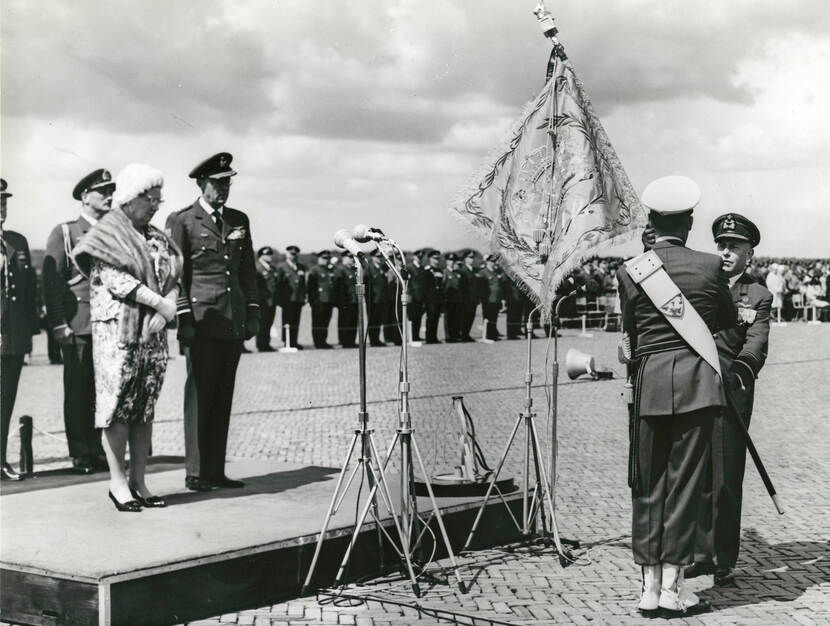 Lees voor meer informatie het uitgebreide artikel in de Defensiekrant. Archieffoto’s van de uitreiking van het luchtmachtvaandel door koningin Juliana op 19 mei 1965 Inmiddels staat ‘Kosovo 1999’ daar ook bij vermeld. Foto’s: uit archief NIMH
