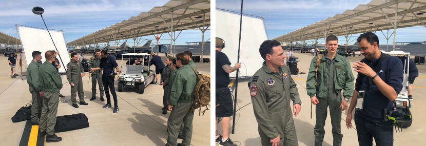 Foto l.: Nayci (r.) in gesprek op de set op Tucson. Foto r.: Plankman (l.) deed het regelwerk binnen de luchtmachtstaf. Luijsterburg (r.) was de man van de luchtopnames. Kapitein Suzanne de Boer-Mateijsen (m.) regelde alles rondom de opnames en de begeleiding.