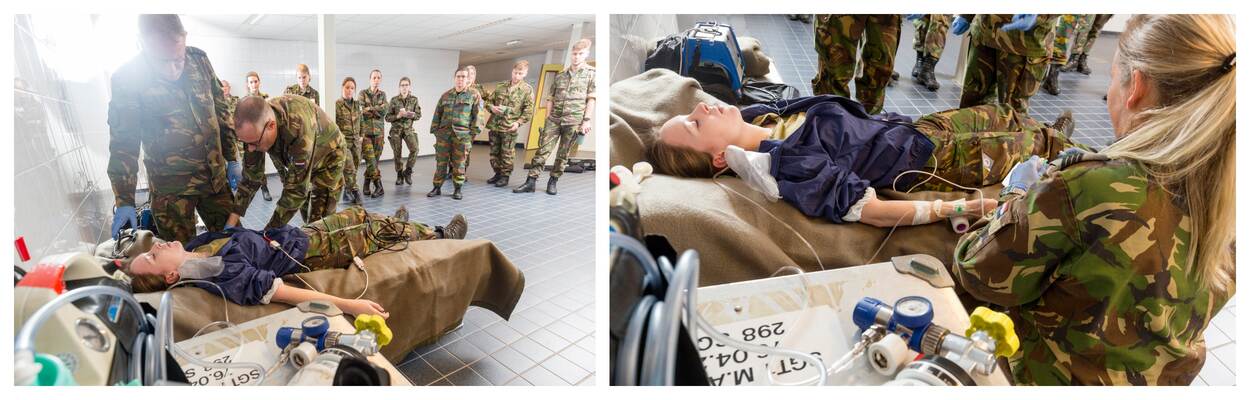 ‘Casualty staging’ is de tweede pijler onder de cursus. Drie lange afmattende dagen worden de cursisten ondergedompeld in het toepassen van protocollen en doctrines ‘hoe je een slachtoffer zo lang mogelijk in leven houdt’. Interne bloedingen, afgerukte ledematen en hersenletsel horen erbij. Zo ook pijnstilling, echografie en tracheotomie. Voor de laatste mogen de cursisten bij een rubber oefenpop een sneetje in de luchtweg maken en er vervolgens een ademtube doorheen steken. “Doe je dit verkeerd, dan heeft het slachtoffer een levensgevaarlijk probleem”, waarschuwt instructeur kolonel vliegerarts Harry Gelissen “Op de juiste plek insnijden en vooral niet te diep.”
