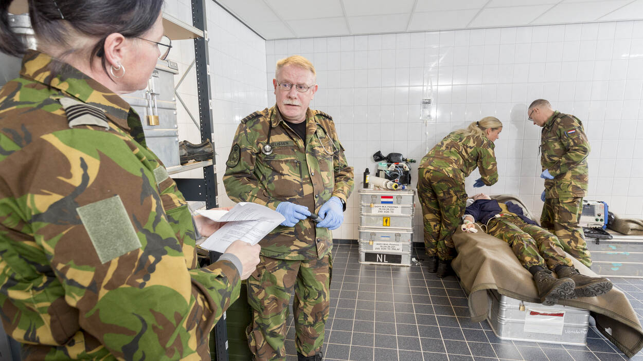 Hieperdepiep! De cursus bestaat precies tien jaar. Tijd voor een feestje? Niet voor de deelnemers. Zij gaan tijdens een oefening begin december meteen vol gas van start op Vliegbasis Gilze-Rijen. Prominent in het driedaagse programma zijn de demonstratiescenario’s. Daarin draait het vooral om de behandeling van gewonden met zogeheten ‘acute problematiek’. In een ver crisisland wordt een genist door een hoogspanningskabel geëlektrocuteerd. Vervolgens tuimelt hij van een zeecontainer. Onder leiding van instructeur-vliegerarts luitenant-kolonel Johan Oele mogen de eerste cursisten meteen aan de slag. Tassen met apparatuur en medicatie vliegen open, kleding wordt kapot geknipt. De patiënt wordt bekeken, bevoeld, beklopt en beademd. Aan de elektrische schok heeft hij slechts lichte eerstegraads brandwonden overgehouden. Zorgwekkend is een bekkenbreuk met een zware interne bloeding tot gevolg. “Stabiliseren en zo snel mogelijk gereedmaken voor transport naar het ziekenhuis”, zet Oele de volgende stap in het behandelplan.