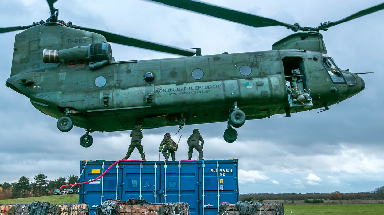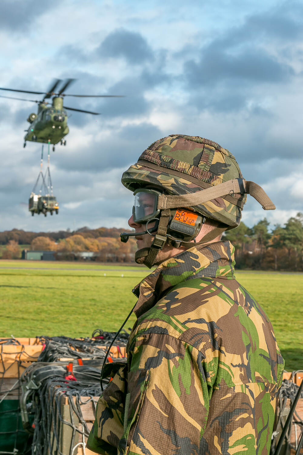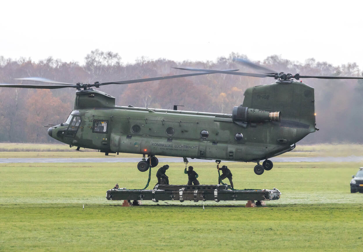 Eind november werkten 11 Luchtmobiele Brigade en het Defensie helikopter Commando samen in de oefening Slingery. Die vond plaats vanaf het Militair Luchtvaartterrein Deelen en op de Ginkelse en Eder Heide. Het 298 Squadron leverde 2 Chinooks en het 300 Squadron 1 Cougar. De helikopters kregen uit Duitsland ondersteuning van 2 NH90’s en ‘riggers’ die hun Nederlandse collega’s van 11 luchtmobiel ondersteunden. Die laatste verplaatsten ladingen voornamelijk met netten. Op de Ginkelse Heide was ook een Forward Refuelling Point ingericht met is 42.000 liter brandstof, waar maximaal 4 helikopters tegelijkertijd konden tanken. Foto’s: Ludo Mennes
