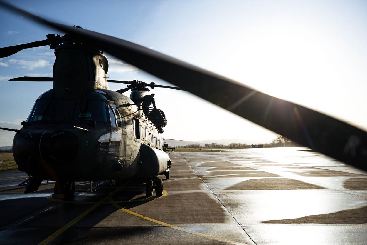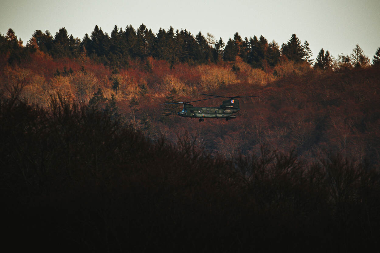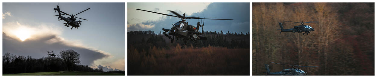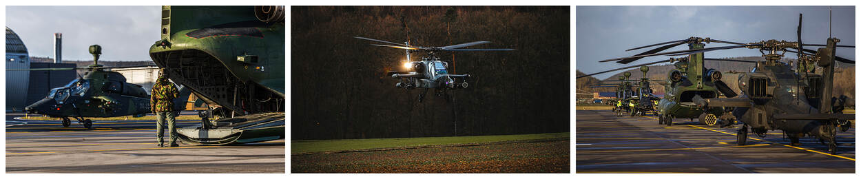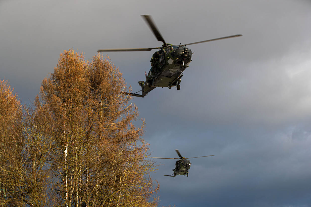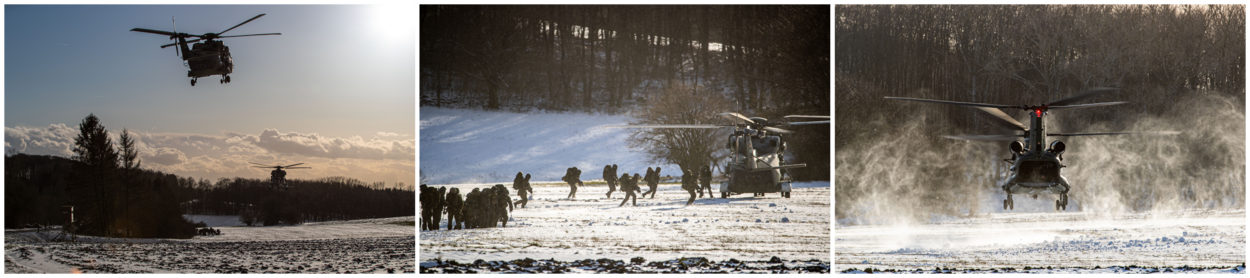 Verdekt achter de boomkruinen hangen de Duitse aanvalshelikopters. Hun landgenoten scheren met 2 multirole NH90-transporthelikopters langs de besneeuwde oefenlocatie, met in hun kielzog een Cougar van het 300 Squadron. Na de white-out-landing van de 3 heli’s klinken er schoten van vijandelijke grondtroepen. Al snel stijgen de heli’s op, weg van het geweld. Wanneer de vijand zich eindelijk gedeisd houdt, is het een Chinook die de mannen van de Luchtmobiele Brigade oppikt en in veiligheid brengt.