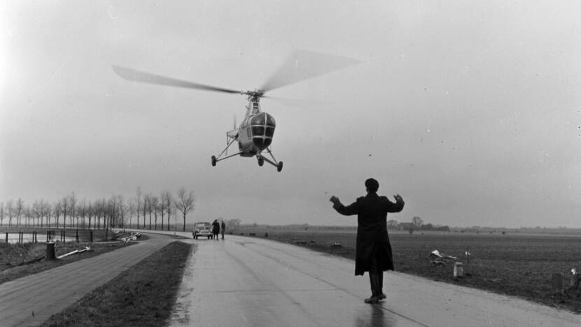Vanaf eind jaren ‘40 leert Idzerda als een van de eerste Nederlanders een helikopter besturen. Hij gaat vliegen op het eerste Nederlandse exemplaar, een civiele Sikorsky S-51 die later wordt overgenomen door de MLD en de naam Jezebel krijgt. Tijdens de Watersnoodramp in februari 1953 redt Idzerda met sergeant Bogert in de Jezebel in Zeeland meer dan 100 drenkelingen (foto onder). Idzerda leidt het aerobatic team de Aero Bats (met Sea Fury), is Commandant 860 Squadron, de eerste straaljagervlieger van de MLD (foto links) en leidt het demonstratieteam Sealords. Hij besluit zijn carrière als Vlagofficier MLD. Op 6 juni 1975 gaat hij met functioneel leeftijdsontslag. Over zijn leven schrijft hij in 2002 het boek ‘Een bevlogen avontuur’. Foto’s: uit collectie Nederlands Instituut voor Militaire Historie