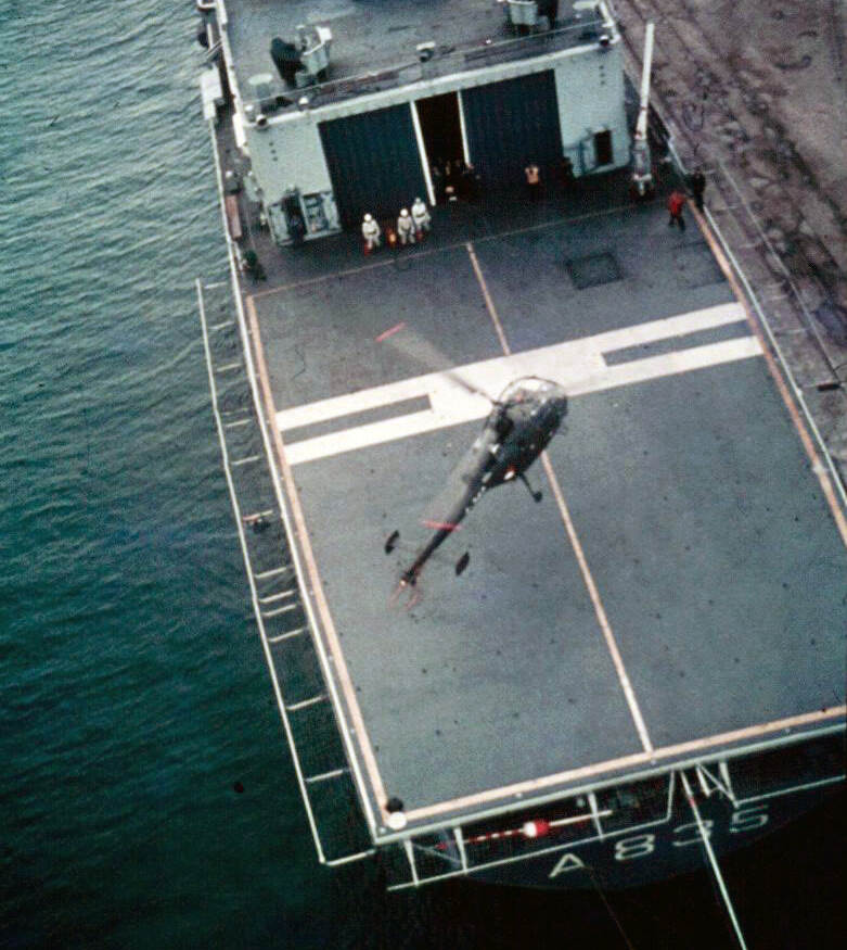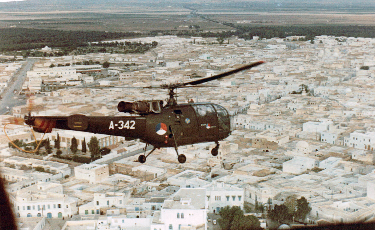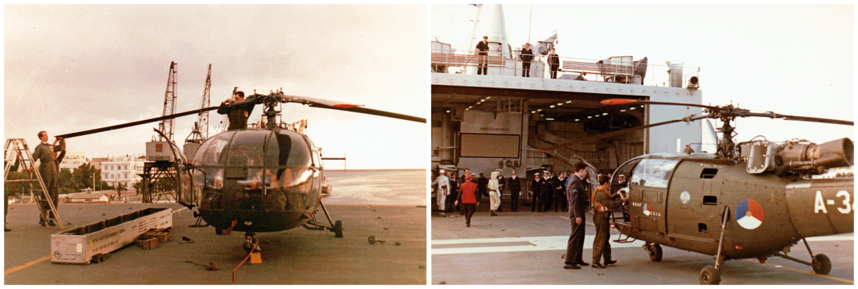 Na vertrek op 22 januari komt het schip na de oefening op 31 januari aan in de haven van Bizerte, de noordelijkste stad van Tunesië. De dag erop monteert de technische dienst de Alouettes op het achterdek. Dan is het tijd voor de check flight. Brinkgreve, in die tijd eerste luitenant: “De commandant van het schip vroeg: ‘hoe denk je ervan af te komen?’, ‘Nou, aanzetten en wegvliegen’, antwoordde ik. Maar dat kon niet volgens hem, want bij de marine had je zoveel knopen dwarswind nodig, anders kon je niet vliegen. Ik antwoordde: ‘Wij staan meestal in Duitsland op een open plek in een bos…’, ‘Oké’, aarzelde hij, ‘maar dan alleen met één vlieger.’ Helaas, dat ging ook niet, want bij een testvlucht móet een monteur mee… Schoorvoetend gaf hij toch akkoord. Na de testen ben ik naar een paar duizend voet gegaan, heb ‘m toen op z’n neus gezet en ben zo op het schip afgevlogen.”