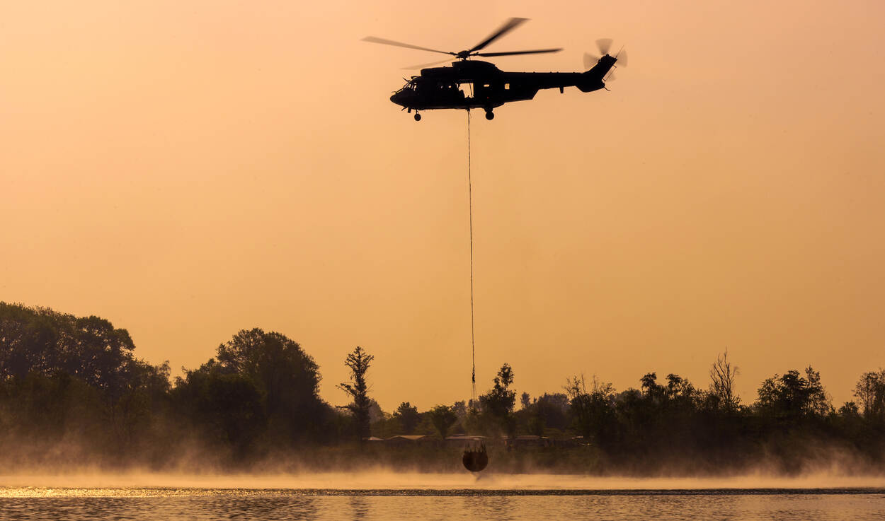 Zwaar beladen hangt de Chinook met een paar minuten boven de brand. Dambacher: “Door de hitte is het best onstuimig in de lucht en vanwege de rook kan je niet vanuit alle kanten aanvliegen. Ook zie je als vlieger de brand niet als je blust, alleen de loadmaster. Die ligt op z’n buik en kijkt door het luik naar beneden.