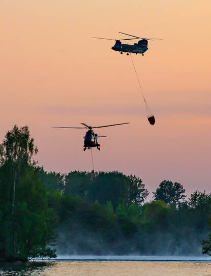 Bij zeer grote of moeilijk bestrijdbare branden vormen het (civiele) Heli-Team Brandweer met helikopters en het Mobile Air Operations Team (MAOT) van het Defensie Helikopter Commando het zogenoemde ‘Fire Bucket Operations (FBO) Team’. Dat werkt dan samen met de civiele brandweer ter plaatse. “Defensie wilde zo’n 10 jaar geleden graag 1 aanspreekpunt voor blusoperaties; dat werd de het Heli-Team Brandweer”, legt Christiaan Velthausz namens Brandweer Nederland uit. “Door de ervaring met branden op de Veluwe, is dit team van oudsher gevuld met natuurbrandspecialisten uit de Veiligheidsregio Noord- en Oost-Gelderland en de Veiligheids- en Gezondheidsregio Gelderland Midden.”
