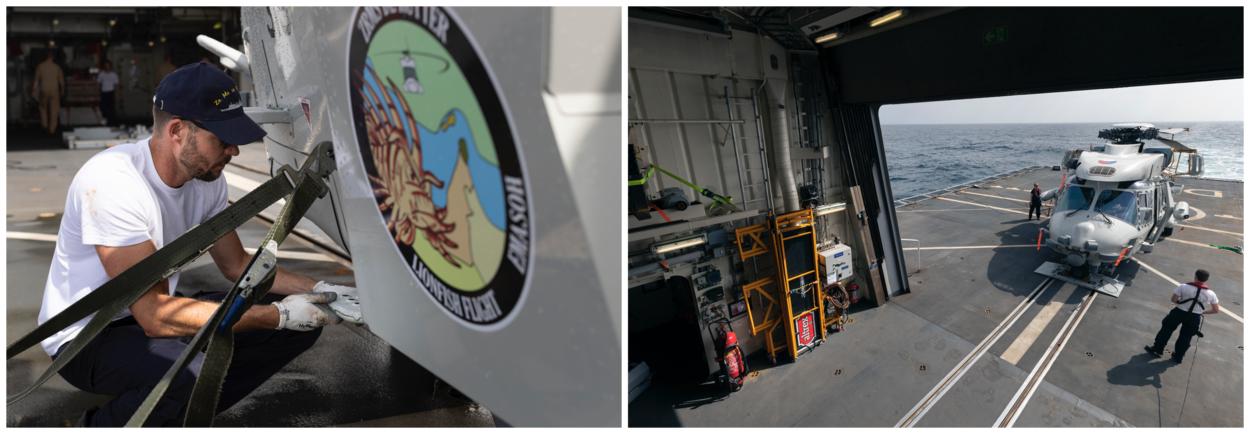 Om dat alles mogelijk te maken, neemt het NH90-team de grootste ruimte van het schip in beslag. Jarno: “En dan nemen we ook nog eens een arsenaal aan spullen mee.” Gelukkig begrijpt de vaste bemanning van Zr.Ms. De Ruyter dat de helikopter belangrijk is voor de missie. “Het schip vertrekt niet zonder helikopter en wij niet zonder schip. We hebben elkaar nodig. We zijn opstappers en hebben een behoorlijke impact op het schip, maar voelen ons welkom. Als we hulp of materiaal nodig hebben, staat de technische dienst voor ons klaar. En als we later moeten eten omdat er met spoed reparaties tussenkomen, warmt de logistieke dienst onze maaltijden op. Ik denk dat we in onze handen mogen knijpen met deze samenwerking.”