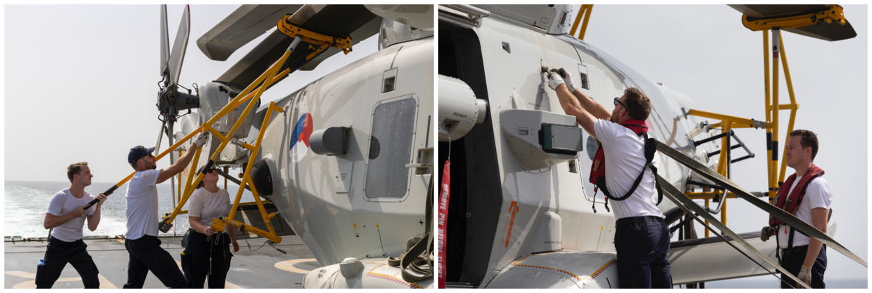 24 uur per dag staat de boordvliegploeg op Zr.Ms. De Ruyter klaar voor inzet. Net als de vliegcrew. Niet alleen bij een noodgeval kan de NH90 niet zonder hulp van het onderhoudsteam. Dag in dag uit wordt flink geklust zodat de helikopter veilig kan vliegen. Een feest, volgens het 6-koppige team dat niet bang is voor vuile handen. “Ook de dagen vliegen.”