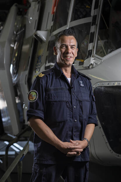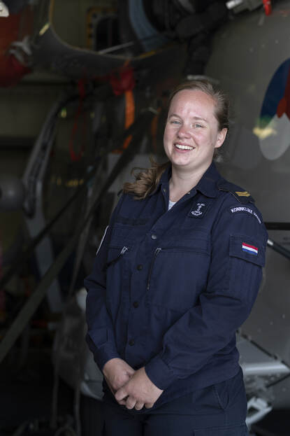 In de hangaar van Zr.Ms. De Ruyter heeft de boordvliegploeg haar eigen domein. “Het is warm, maar de mooiste plek van het schip”, vertelt korporaal Kim. Hier staat namelijk de NH90-gevechtshelikopter. “Ons kindje”, lacht sergeant Jarno. “Ik ben altijd gek geweest van helikopters en vliegtuigen. Bij Defensie is het werk extra gaaf omdat we werken met wapensystemen en sensoren die je in de burgerluchtvaart niet tegen komt.”