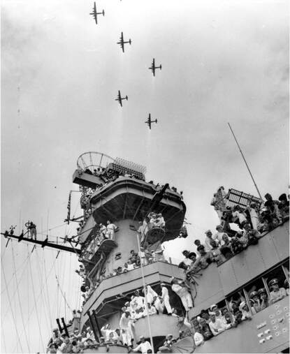 Op 2 september wordt de overgave van Japan ondertekend op het Amerikaanse slagschip USS Missouri in de baai van Tokyo. Direct daarna klinkt het indrukwekkende slotakkoord van de militaire luchtvaart. Een steeds zwaarder wordende trilling is voelbaar en geronk zwelt tot bijna oorverdovend aan. Aan de horizon is te zien waarom. Om de overmacht van de geallieerde kracht bij te zetten, volgt er een fly by van 450 US Navy vliegtuigen (foto onder) en liefst 525 US Army Air Force B-29 bommenwerpers.