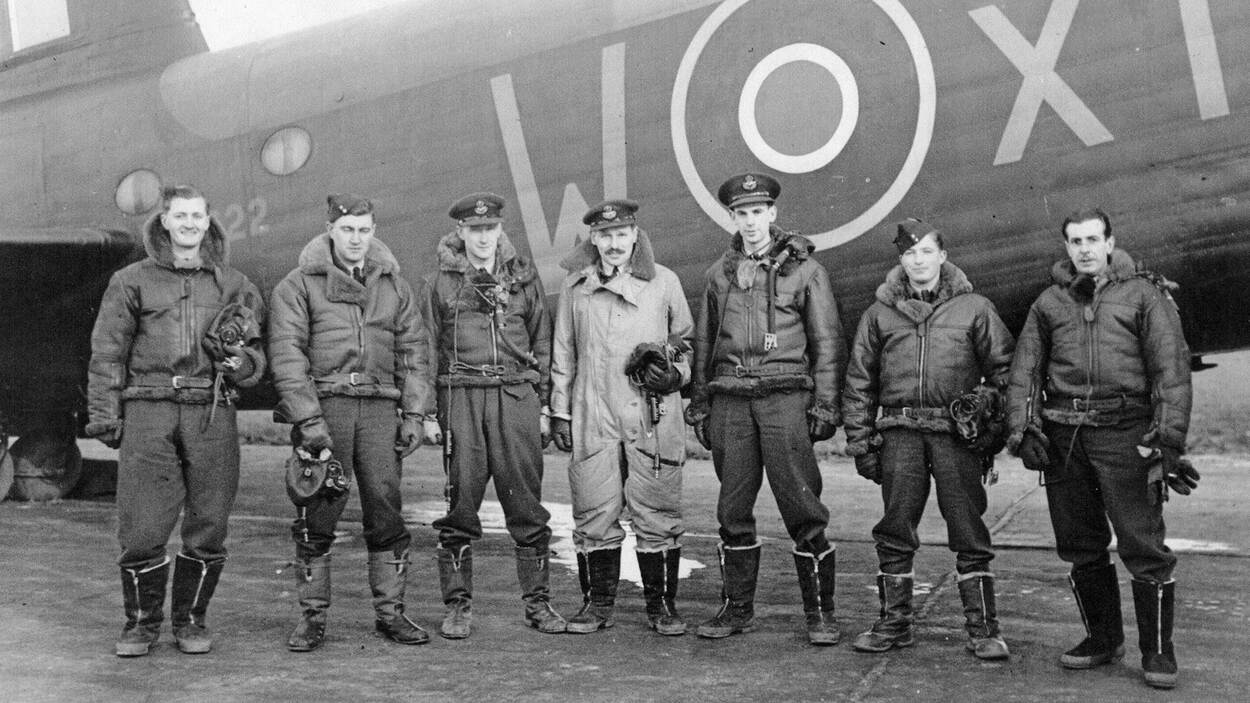 De bemanning van de BK716, hier in februari 1943 poserend voor een andere Short Stirling, met van links naar rechts: sergeant Ronald Kennedy (22; boordwerktuigkundige en boordschutter), sergeant Leonard Shrubsall (30; boordwerktuigkundige en boordschutter), flying officer John Michael Campbell (30; radio operator en boordschutter), flying officer John Harris (29; gezagvoerder), flying officer Harry Farrington (24; navigator, RCAF*), flight sergeant John McCaw (20; staartschutter, RCAF*) en sergeant Charles Bell (29; bommenrichter).