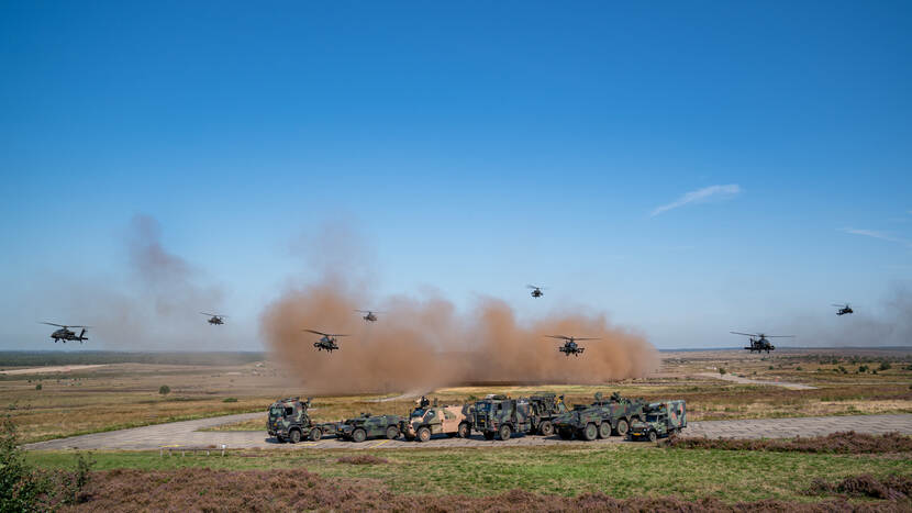 Deze oefening was er een in het kader van hoofdtaak 1: het beschermen van Nederlands grondgebied. “Het scenario was staal op staal, dus tanks die de bedreiging vormen en wij schakelden ze uit”, legt Diego uit. “Command and Control is met 8 helikopters heel anders dan met kleinere aantallen. Je volgt en managet alle gevechtshandelingen vanuit de cockpit en er gebeurt dan zóveel. We kónden dit nu een keer doen en wílden het ook. Dit was waarschijnlijk ook de laatste keer mogelijk met de AH-64D. De komende jaren zijn er minder heli’s beschikbaar omdat we afbouwen voor de conversie naar de AH-64E.” Foto: KLu