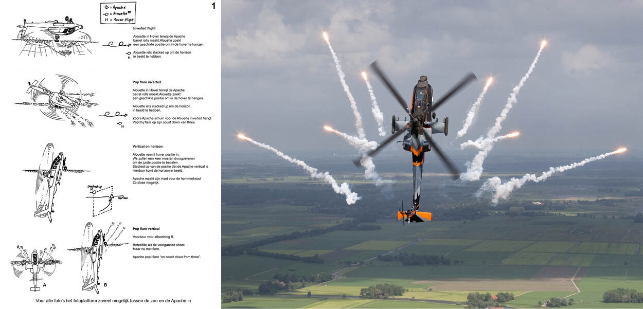 Voorafgaande aan een vlucht geeft Arnoud altijd precies aan wat hij wil. Op een zogenoemd storyboard tekent hij tot in detail hoe hij 1 of meerdere vliegtuigen gaat fotograferen, in welke formatie of tijdens welke manoeuvre. In een zeer gedetailleerd vluchtplan geeft de specialist koers, hoogte en snelheid aan. Ook belangrijk is waar de zon staat. Blijkt die inschatting niet juist, dan moeten de vliegers van koers veranderen, wat tijd kost. Bovendien zitten zij niet te wachten op onverwachte bewegingen. Zeker niet wanneer zij dicht bij elkaar in formatie vliegen. Verder spelen er nog dingen mee als de keuze van de achtergrond, de instelling van de camera en welke objectieven er mee moeten. “Voordat je opstijgt, heb je de foto’s in gedachten eigenlijk al genomen”, slaat Arnoud de spijker op de kop. “Veel zaken die we in de voorbereiding bespreken, hebben overigens niets te maken met de foto- of video-opnamen, maar alles met de veiligheid.”