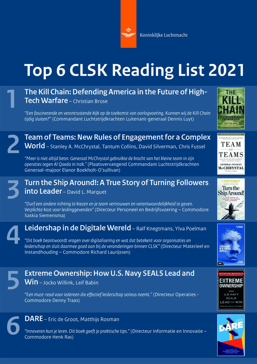 Thuisblijven tijdens corona, voorjaarsvakantie, gewoon ’s avonds of in het weekend: momenten genoeg om te lezen. Geen inspiratie voor een goed boek? Geen probleem. De luchtmachtleiding stelde samen met een aantal collega’s in het land een CLSK Reading List op. In de eerste editie vindt u de Top 6 aanbevolen boeken door de Luchtmachtraad.