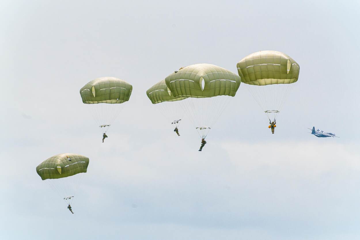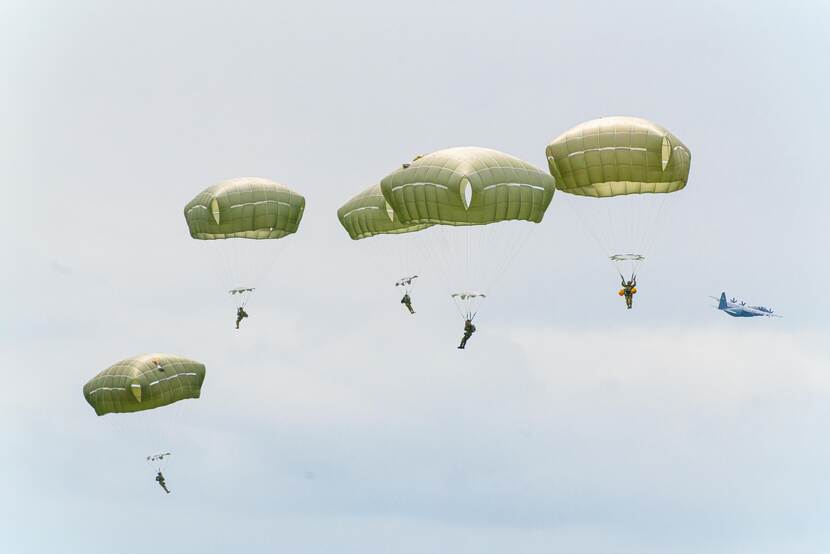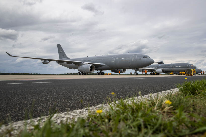 Over zo’n twee tot drie jaar verhuist de Defensieparaschool van Breda naar Vliegbasis Eindhoven. Zowel nationale als internationale eenheden worden er opgeleid. Commandant AMC: “Samen zijn we allemaal gerelateerd aan ‘air mobility’; een goede stap dus om het straks hier op het veld te hebben!” Foto: Louis Meulstee De drie internationale organisaties Multinational MRTT Unit (MMU), European Air Transport Command (EATC) en Movement Coordination Center Europe (MCCE) zijn medegebruikers van Vliegbasis Eindhoven én strategische partners van het AMC. Op de voorgrond van de foto staat een A330 MRTT, het nieuwste vliegtuigtype dat zijn thuisbasis op Eindhoven heeft. Foto: sergeant Cinthia Nijssen