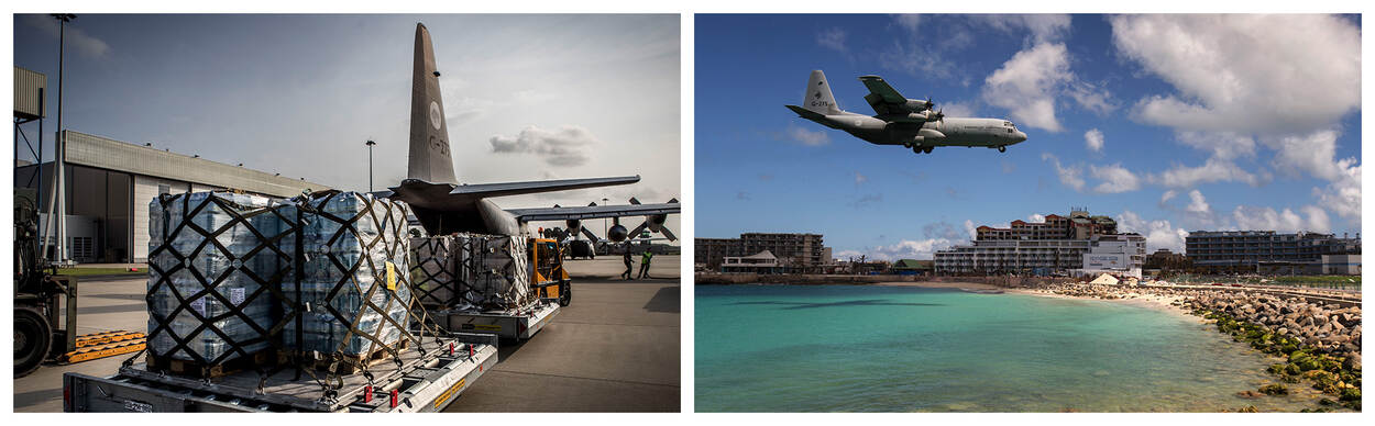 Direct nadat orkaan Irma over de eilanden in de West raasde, zette Defensie vanaf Eindhoven een C-130 en een KDC-10 in om hulp te bieden in het getroffen gebied. Foto links: Maartje Roos; rechts: sergeant-majoor Gerben van Es