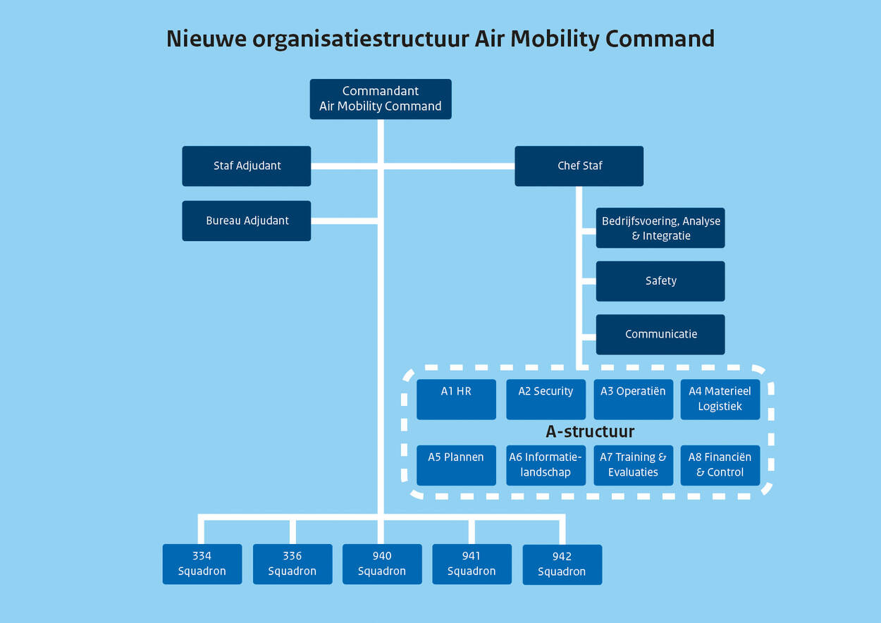 De twee grootste veranderingen na de transitie zijn de squadrons die nu rechtstreeks onder de commandant AMC vallen en de A-structuur waaruit de staf is opgebouwd. Dat laatste wordt ook zo binnen de NAVO en tijdens uitzendingen gebruikt. Waarschijnlijk is de nieuwe indeling een verademing voor het personeel op Eindhoven. “Veel militairen vonden het vreemd dat de organisatie tijdens een uitzending efficiënter werkt dan gewoonlijk in Nederland”, weet de commandant.