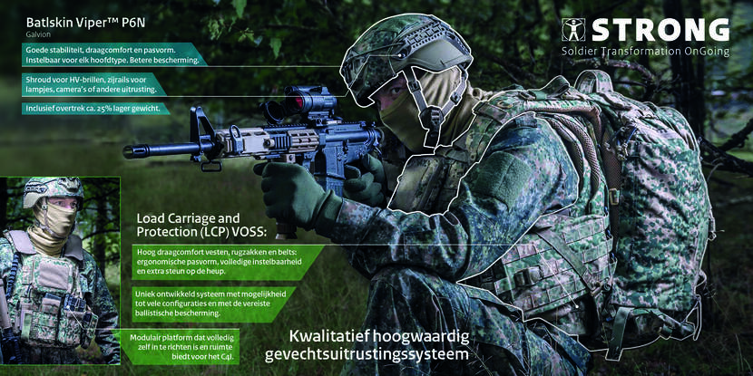 Zo’n veertigduizend Nederlandse militairen in het nieuw steken doe je niet zomaar. Maar vanaf dit voorjaar vervult Soldier TRansformation OnGoing – kortweg STRONG – in vier jaar tijd de langverwachte vervanging van helm, kleding, laarzen en uitrusting. Alles binnen de armlengte van de militair wordt vervangen.