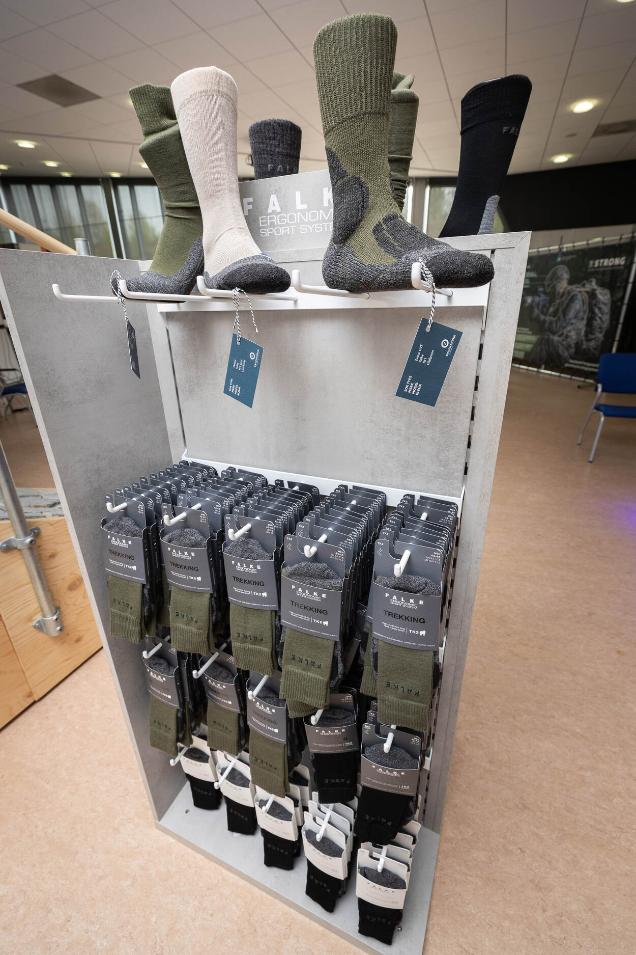 Om het af te maken krijgt elke militair ook nieuwe kwaliteitssokken. Waarom? “Ze vormen in combinatie met de nieuwe schoenen als het ware één systeem dat om de voet hoort”, legt Delfgou uit. “We hebben ervoor gekozen steeds de beste sokken bij een categorie laarzen te leveren. Iemand met een zware gevechtslaars krijgt daarom een ander type sok dan een collega met de medium-gevechtslaars.