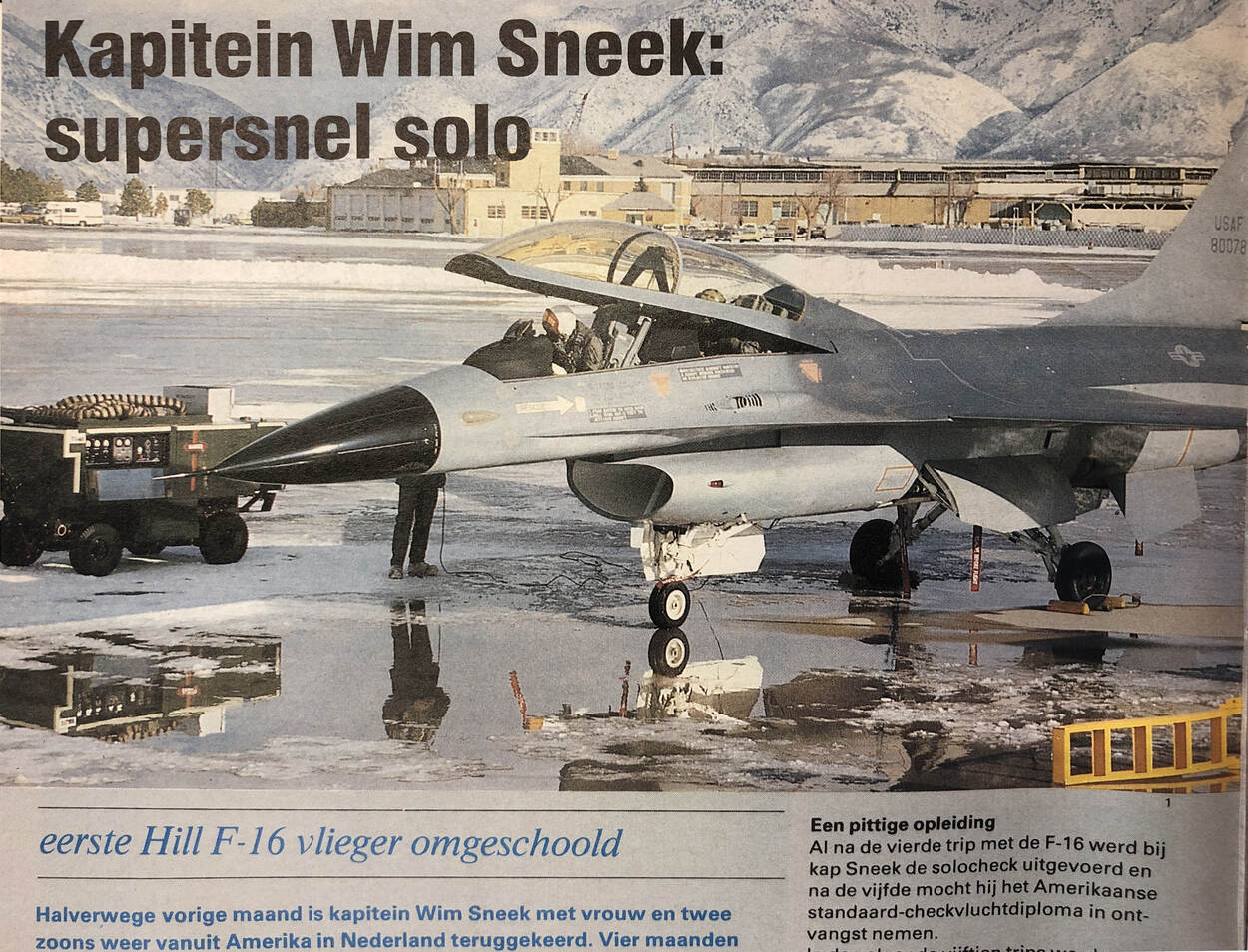 Inmiddels is dat ruim 42 jaar geleden. Sneek (inmiddels 79) is al een aantal jaar daarvoor bezig met de ‘aanschaf van de eeuw’, zoals de F-16 dan ook in het nieuws is. Hij wordt in 1976 op de Staf van de Koninklijke Luchtmacht in Den Haag geplaatst. Vanaf dan vliegt hij al geregeld naar de Verenigde Staten voor het F-16 project, meestal naar de fabriek van de – oorspronkelijke – fabrikant General Dynamics in Fort Worth, Texas. Sneeks opdracht is onder meer het opzetten van de Transitie en Conversie-afdeling All Weather (TCA) op Leeuwarden, waar de Nederlandse Starfighter-vliegers omgeschoold worden op het nieuwe type. Voor zijn eigen opleiding gaat hij in december 1978 naar Hill Air Force Base (AFB) in Utah, samen met zijn vrouw en twee zonen. Sneek is overigens niet de eerste Nederlandse F-16 vlieger. Dat is majoor Steve Heijboer die operationele testen uitvoert bij de F-16 Joint Test Force, eerst op Edwards AFB en later ook op Hill.