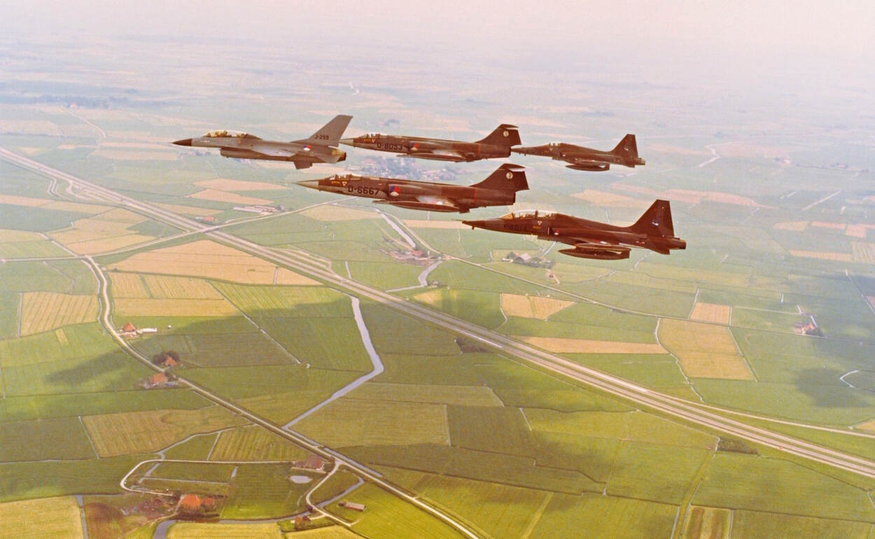 Na een introductierondje boven de Friese elf steden komt de formatie van twee Starfighters, een duo NF-5’en en de eerste Nederlandse F-16, op 7 juni 1979 boven vliegbasis Leeuwarden aan. Bij de tweede passage breekt de Fighting Falcon uit de formatie en klimt bijna verticaal de wolken in. Vlieger Wim Sneek laat daarna meteen zien waartoe de F-16 in staat is. “Het toestel kan ongelofelijk krap draaien.”
