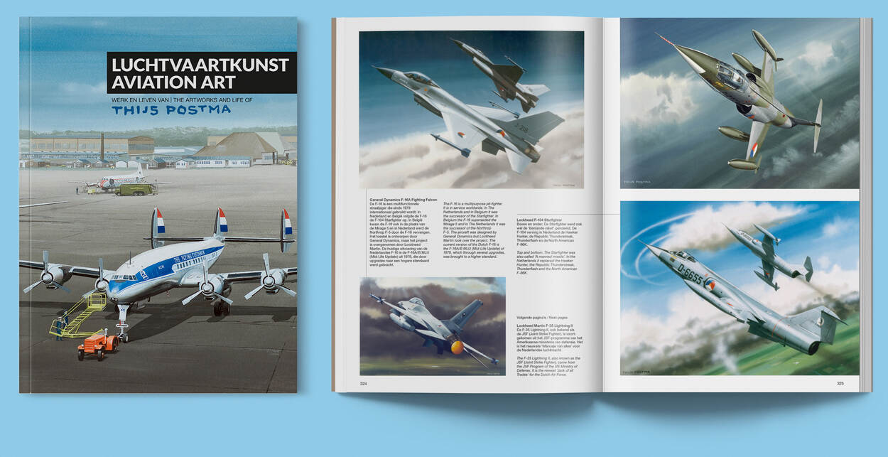 De naam Thijs Postma staat al vele decennia synoniem voor luchtvaartkunst. Zijn gouaches (schilderijen met een dekkende waterverf) staan al tientallen jaren in luchtvaarttijdschriften en verschenen in boeken. Maar niet eerder werd een totaalbeeld van zijn collectie in boekvorm uitgeven. Nu wel, onder de subtitel ‘werk en leven’. Dat dit om meer gaat dan alleen luchtvaartschilderingen, wordt heel duidelijk in het bijna vierhonderd pagina’s tellende boekwerk. Het is tegelijk zijn autobiografie, voorzien van heel veel gouaches van – uiteraard – civiele en militaire luchtvaart, maar ook auto’s, boten en portretten. Van de 580 gouaches die Postma maakt, staan er vele in het boek.