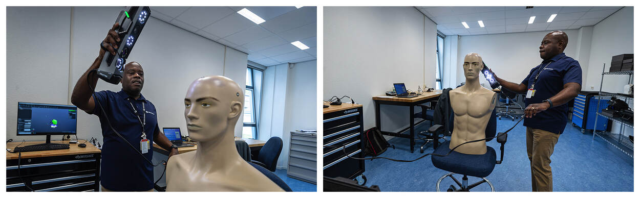 Dat kan, want Collins stuurt twee man naar Soesterberg waar ze samen met Meeuwsen in twee doorsnee kantoorruimtes het PRC bouwen. In Amerika gebruiken ze daar veel grotere ruimtes voor. Het PRC werkt met een prototype scanner om vliegers op te meten, nauwkeurig tot op een tiende millimeter. Daar heb je zeker een groot apparaat voor nodig? “Zeker niet”, zegt Meeuwsen. “Het is nu nog een beetje een log apparaat, maar over een paar jaar is die scanner zo groot als je huidige smartphone. In de andere ruimte staat een prototype van een freesmachine die in twintig minuten een complete binnenkant van de helm maakt. En het wérkt geweldig. Dat testen we namelijk meteen. Daarvoor hebben we hier een complete instelling met een F-35 schietstoel staan.”
