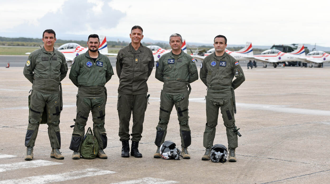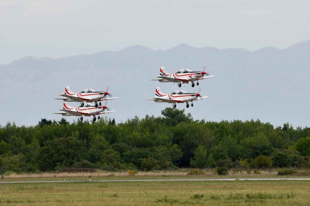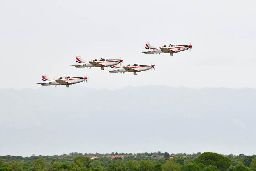 Een demonstratieteam van de luchtmacht met propellervliegtuigen: dat is al een bijzonderheid. Dat de zes leden van de demoploeg dit doen naast hun dagelijks werk als instructeur, maakt het min of meer uniek. “Ze oefenen zo’n vijftig tot zeventig uur per jaar”, weet luitenant-kolonel Robert Riberić, commandant van het 392 Fixed Wing Squadron op Zadar Airbase. Zijn eenheid bestaat uit zeventien PC-9M toestellen van het Zwitserse Pilatus – het jongere en grotere broertje van onze PC-7 – en vier Tsjechische Zlín 242L’s.