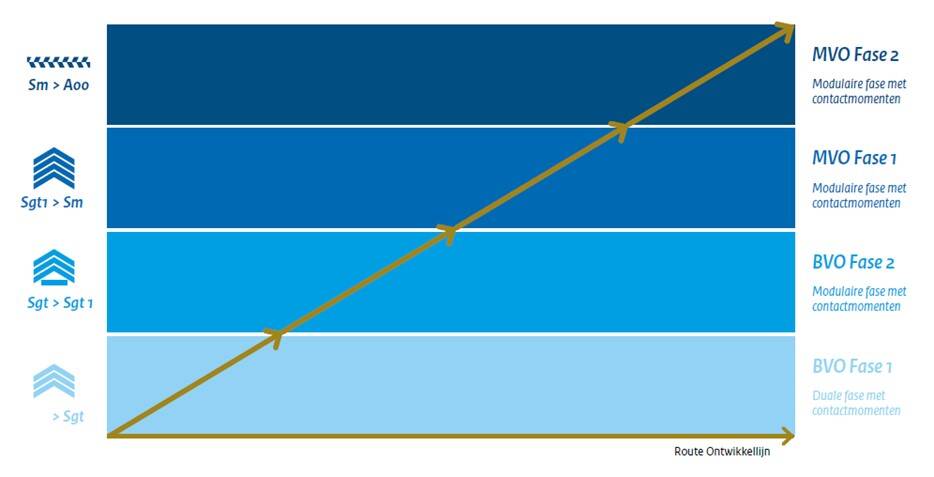 Dat vraagt om maatwerk en daarom geeft Luchtmachtadjudant Peter Massop in 2018 de opdracht voor het herschrijven van de opleidingen. EVO is de naam van de nieuwe afdeling die ze gaat verzorgen. De opleiding zelf heet nu de Ontwikkellijn en bestaat uit vier niveaus: de basis en de middelbare vorming, kortweg de BVO en MVO (zie onderstaand schema).
