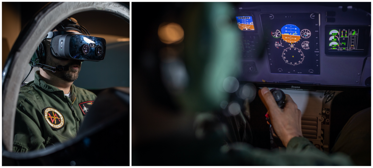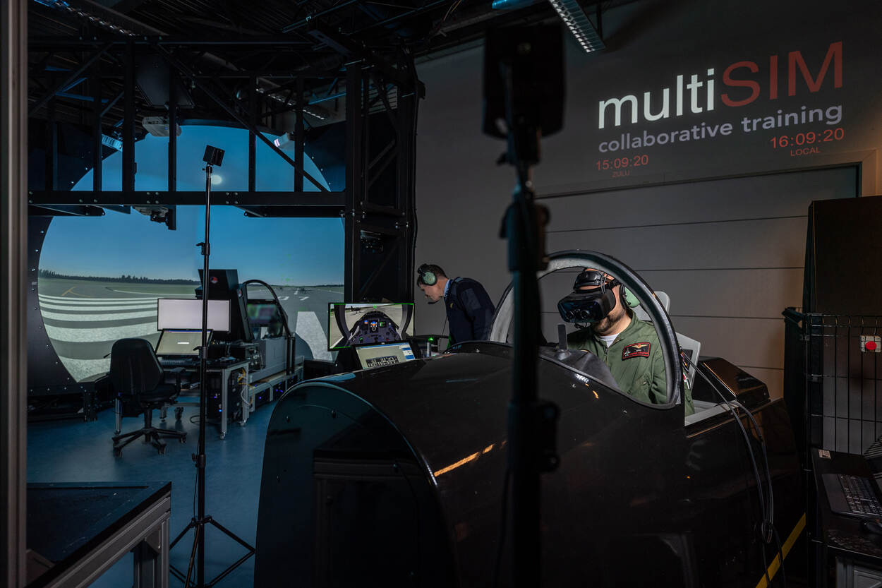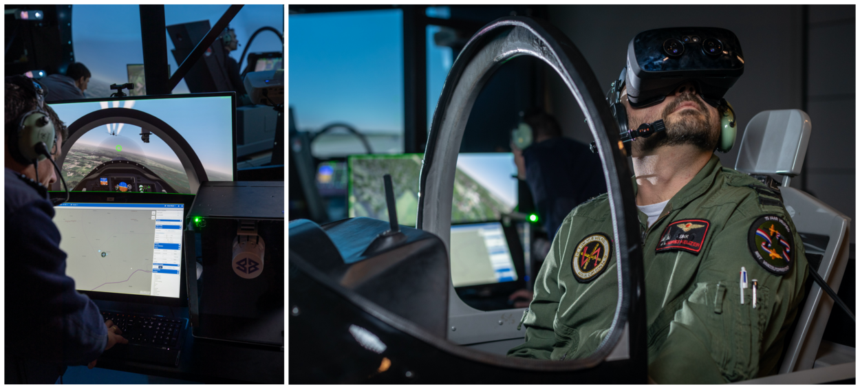 In een van de vele onderzoekskamers van TNO Soesterberg staat een proefopstelling van wat volgens de planning nog dit jaar op het opleidingscentrum in Woensdrecht komt te staan. Het is een opgelapte oude mock-up van een PC-7 cockpit, die tot voor kort in een hoekje op Woensdrecht stond te verstoffen. ‘Perfect’, dacht Keijzer destijds, ‘die kunnen we relatief makkelijk en snel ombouwen tot een goed lijkende simulator’. Hij stapt in, zet de VR-bril op en belandt in de 360 graden gesimuleerde omgeving van Vliegbasis Woensdrecht. Behendig vliegt hij weg. Starmans, zowel voormalig PC-7-instructeur als NH90- en Apache-vlieger, kruipt voor de gelegenheid in de huid van instructeur en volgt hem via het computerscherm dat naast de cockpit staat. Tot dusver weinig nieuws. Dit soort simulatoren wordt al veelvuldig gebruikt.