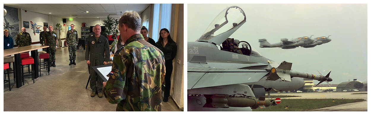 Ruedisueli werkt nu bij het 306 Squadron op Vliegbasis Leeuwarden waar hij de onderscheiding kreeg tijdens een werkbezoek van de C-LSK. Foto's: KLu en Canadian Armed Forces