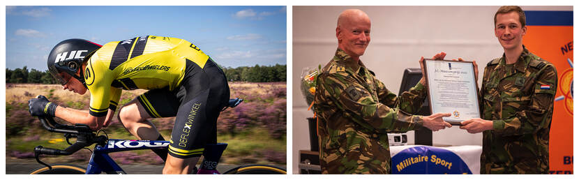 Ook in civiele wedstrijden presteerde Lemmen opvallend. Hij werd derde bij het Nederlands kampioenschap voor Onbetaalde Renners, won in Limburg de klassieker de Eurode Omloop en in België etappes in de Arden Challenge, een meerdaagse wedstrijd in de Ardennen. Had hij niet ‘lek’ gereden, dan had Lemmen volgens eigen zeggen gewonnen. Een pleister op de wonde was de bolletjestrui die hij won, de prijs voor de beste klimmer. Verder pakte de kapitein de tweede plaats in de Ronde van Utrecht en werd verdienstelijk achtste bij het door wereldtopper Tom Dumoulin gedomineerde nationaal kampioenschap tijdrijden. Lemmen: “Dit jaar wil ik proberen om op een nóg hoger niveau te koersen.” Foto links: sergeant Cinthia Nijssen; rechts: sergeant-majoor Maartje Roos