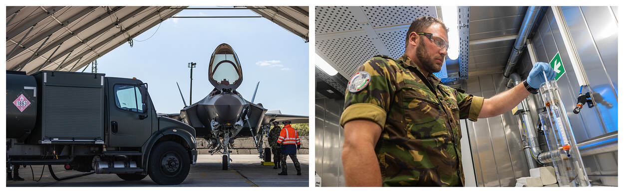 Dat er hoge kwaliteitseisen gesteld worden aan alles rondom de F-35 ondervindt ook sergeant Dennis, specialist POL (petrol, oil an lubricants). Voor de brandstof heeft de NATO Support and Procurement Agency (NSPA) een contract afgesloten met een externe brandstofleverancier, een paar landen verderop. En dat zorgt voor een uitdaging voor Dennis. “Als ik vandaag de brandstof bestel, wordt deze twee dagen later bezorgd. Daarmee moeten we rekening houden in de planning. We gaan ervan uit dat deze brandstof van hoogwaardige kwaliteit is, maar voordat we het innemen, wordt er altijd eerst een kwaliteitscontrole gedaan. De uitslagen zijn tot nu toe goed, maar het is best spannend als je denkt aan de gevolgen. Als de brandstof onder de norm wordt aangeleverd, moet het terug en zijn we een paar dagen verder voor er weer nieuwe is.”